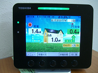 ⇒発電状況がひと目で解るモニター(青いランプは中電に電気を売っているサイン。赤いランプは中電から電気を購入しているサインです。)