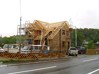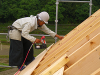 写真は建て方大工が屋根の上で合板を張っているワンシーン。下から作業を見ていると、いとも簡単に作業をしているかの様に思えるが、屋根の上に上るとスキーのジャンプ台に上った様な感じである。「こんなに急勾配だったのか!?」といつも思う。