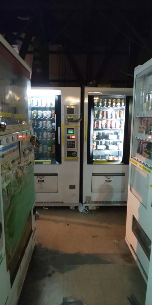 先日、出張で晩御飯を済ませてホテルに帰る途中偶然見つけてしまいました。廃屋の様な建物の中にある超怪しい自販機コーナー・・・