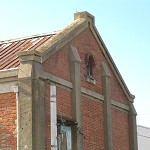 窓の上のレンガの積み方を見て欲しい。丁度石の橋の様に垂直荷重が左右に逃げ、構