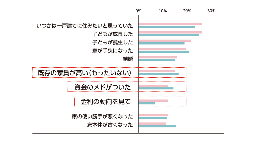 予算における家づくりのきっかけで多かった意見を見ていくと、「現在の家賃が高い(もったいない)」「資金のメドがついた」「金利の動向を見て」が上位にきています。