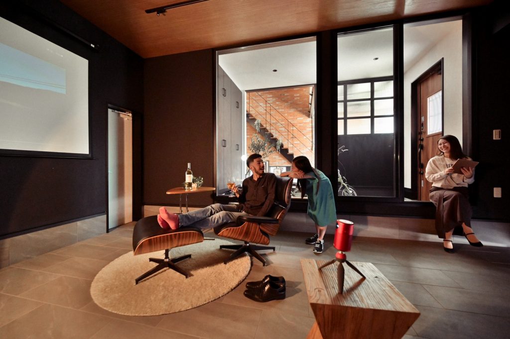 この空間に、革のソファ、アイアンの椅子や照明器具、無垢材のテーブルやチェストなどを配し、黒や濃い茶色などダークな色を多用し、スタイリッシュな雰囲気にコーディネートをします。