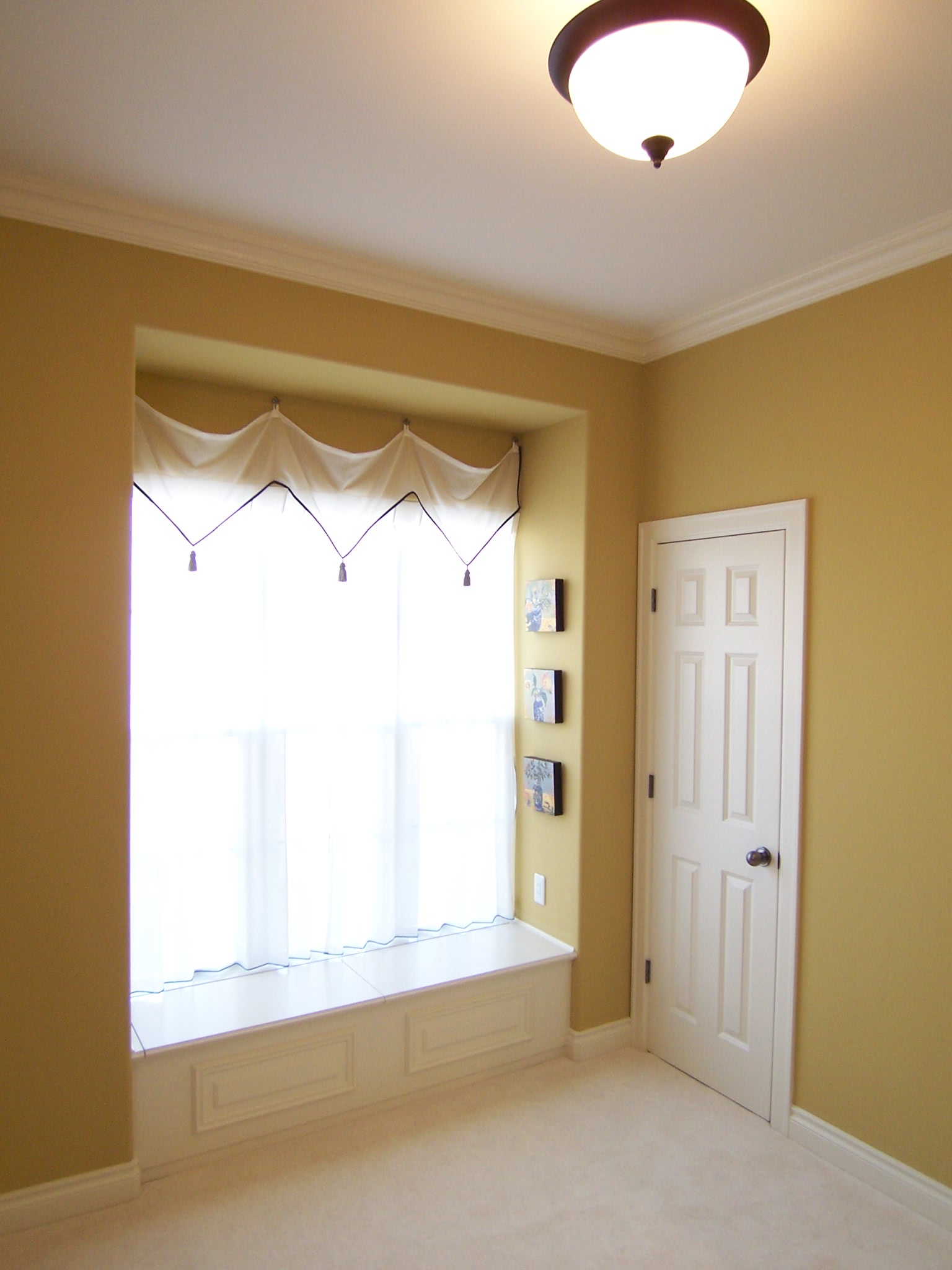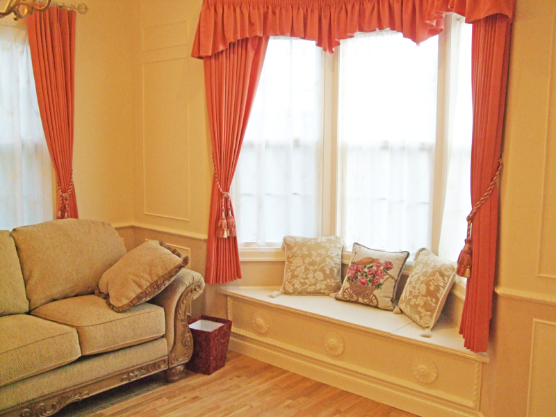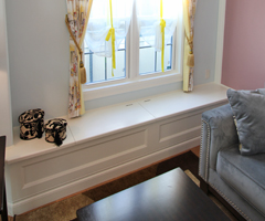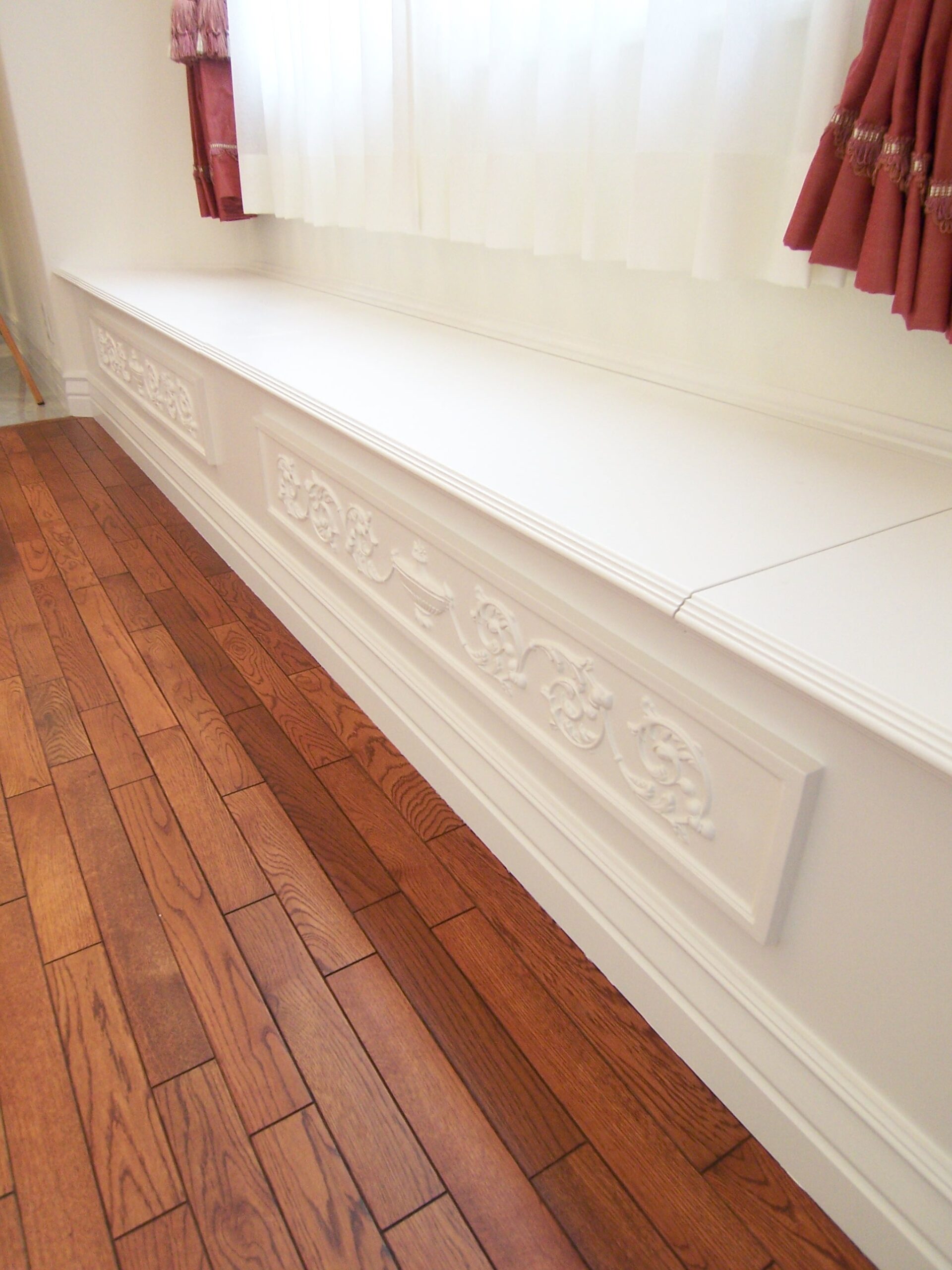 ベンチはよく出窓部分につくりますが、出窓がなくてもお部屋に変化を持たせたい場合などに採用します。側面の外側を二重貼りにして立体感を出したり、おしゃれな飾りをつけたり、帯を打ってエレガントな雰囲気を出したり、デザインもいろいろと手を加えることができるので、自分の好みに応じたベンチが楽しめます。