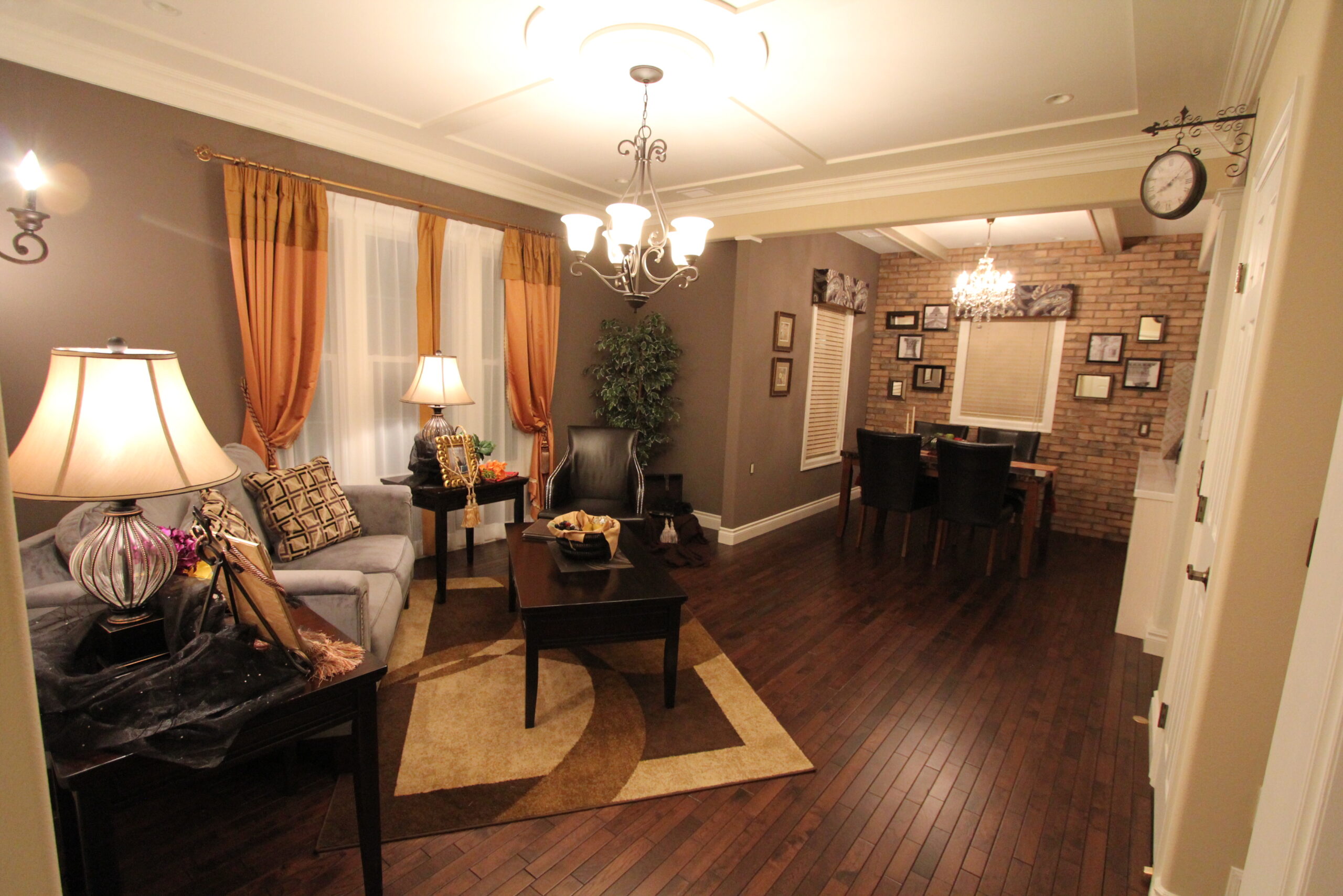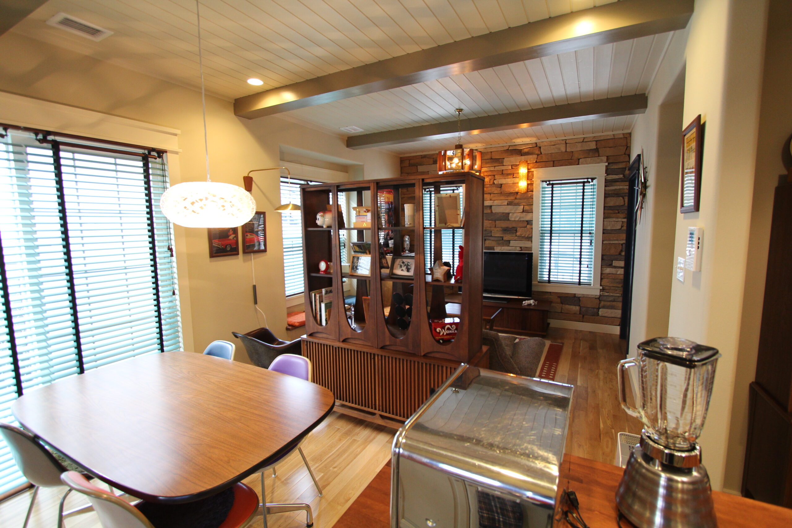丸みのあるテーブルランプ、モダンなイメージの照明器具、現代的なアートや小物などが、全体の雰囲気をミッドセンチュリーたらしめるアクセントとなります。