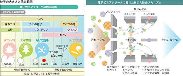 一般的なフィルタの場合、約10μm(スギ花粉程度)までとれますが、電子式エアクリーナーは0.01μm(タバコの煙等)の小さい粒子までとれるような設計になっています。