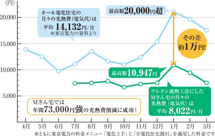 オール電化住宅の1月の光熱費20,000円越えに対しウレタン遮熱工法の家は10,947円。その差は約1万円です。