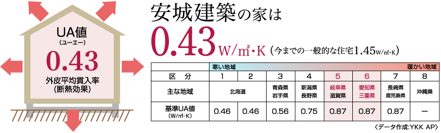 安城建築では以下にご紹介する様々な技術の組み合わせにより、断熱性能を表すUA値0.43を実現。