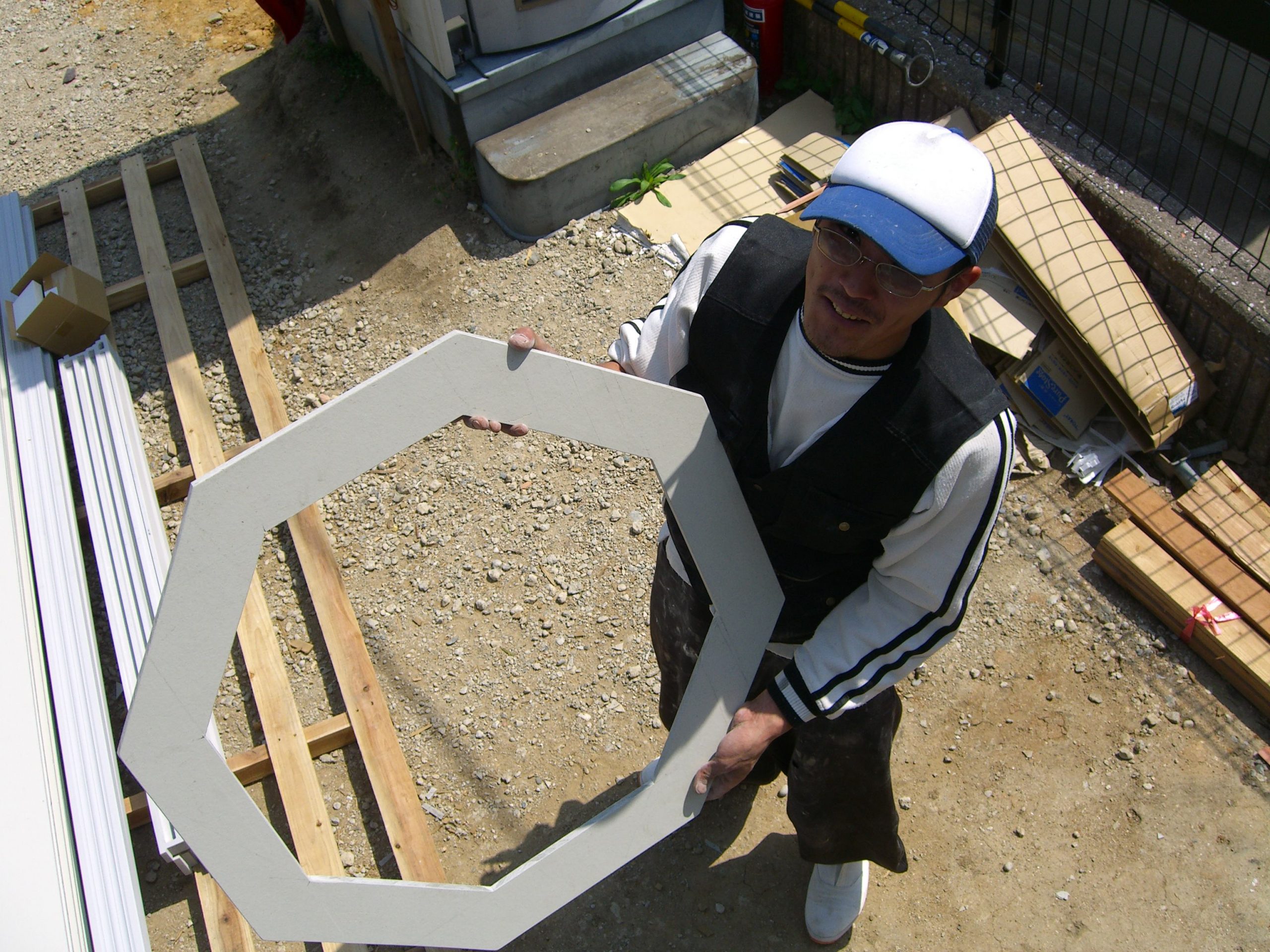 八角形の窓の枠を 一枚物の外装材から抜き取る