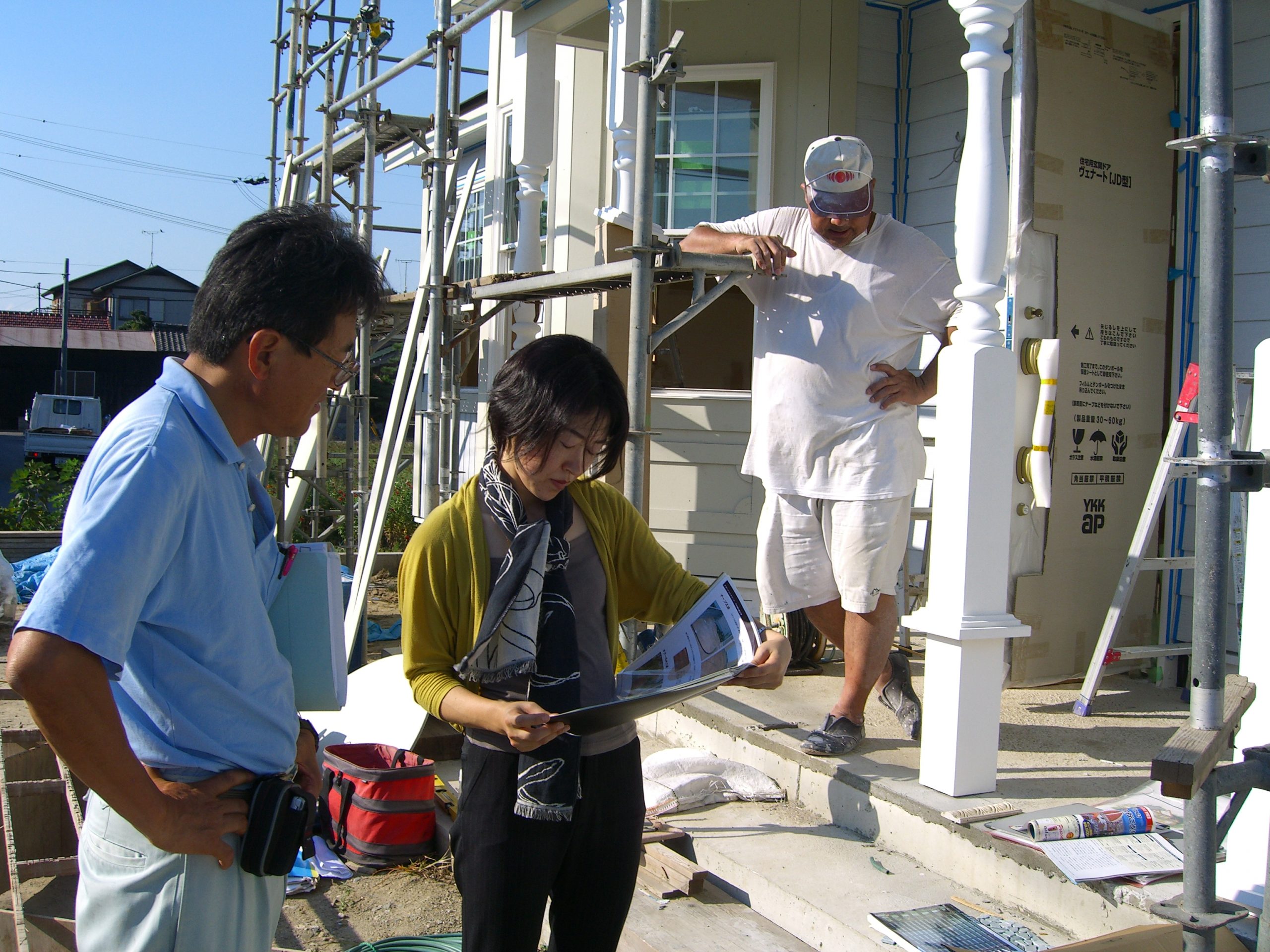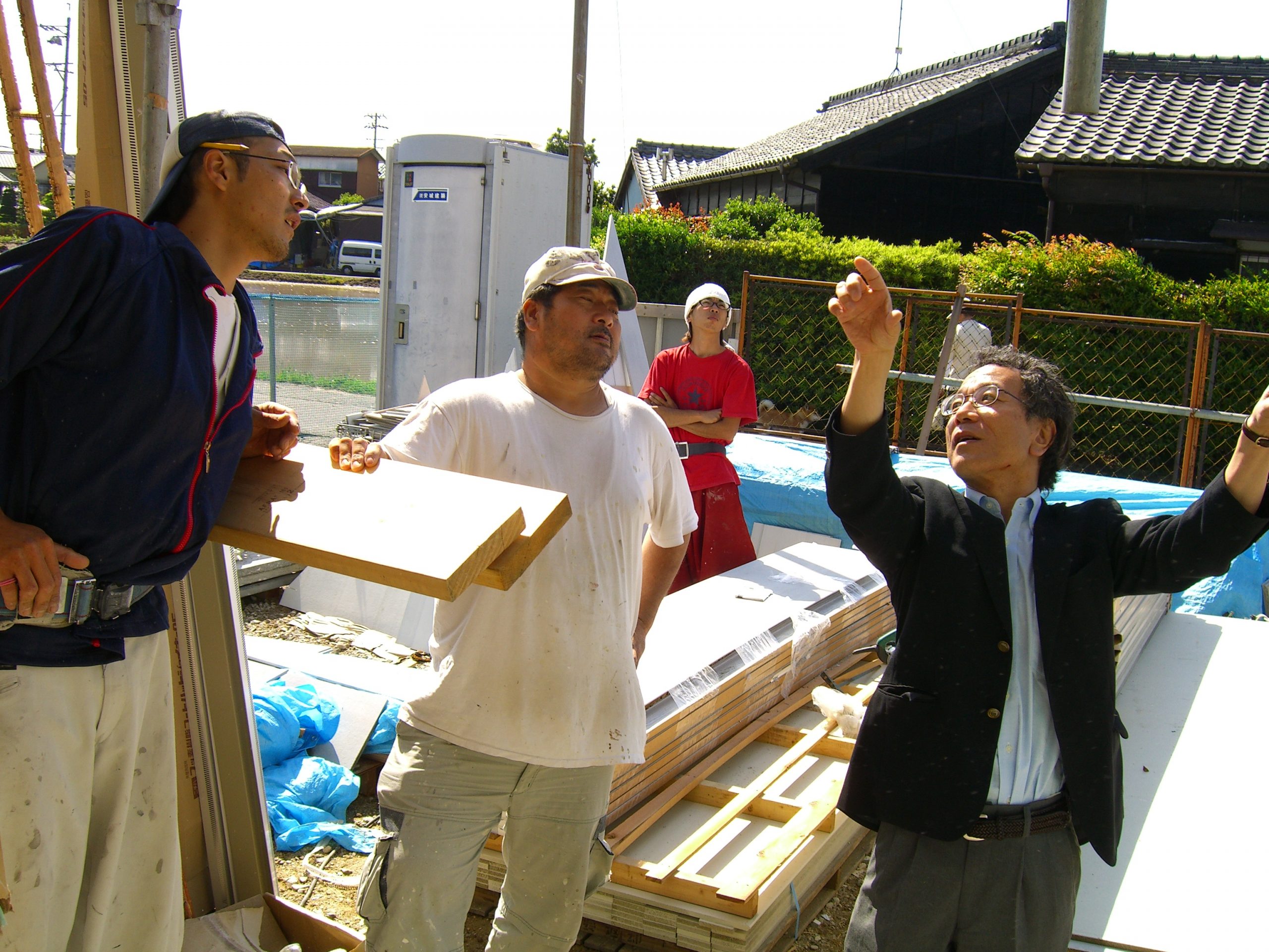 建築家と外装職人の話に加わる塗装職人。