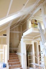 弊社のドライウォールは職人自ら米国のベテランドライウォーラーの元で修行し習得したもので、隠れてしまう部分ですが、下地のドライウォール専用の石膏ボードを使用し、北米同様の手順によりボードが張られ、その下地に対し、純粋な北米式のドライウォール工法が施工されています。