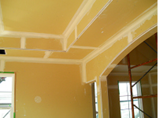 例えば、石膏(せっこう)ボード。正しいドライウォール工法には、ドライウォール専用の石膏ボードを使用する。壁の石膏ボードも一般的な910㍉×2430㍉のサイズより130%大きい1220㍉×2430㍉のサイズの石膏ボードを使用する。サイズが大きいのは、可能な限り接合部を少なくし、割れにくくする為である。又、この専用の石膏ボードには石膏ボードと石膏ボードの接合部分の目地処理がしっかり出来る様に、なだらかなくぼみがある。