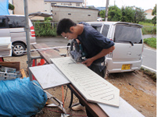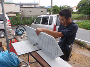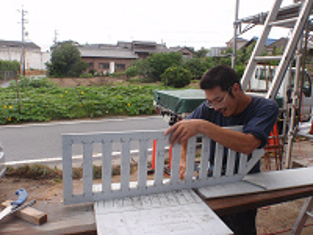 写真は、現在大府市で施工中のイタリアンテスタイルの現場での作業風景。外部の装飾に使用するパーツを一枚の外装材から切り絵の様に細工を施している。もはや建築の領域を越し、アートの領域に達していると感じました。