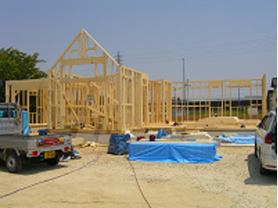 ⇒建て方中の現場。構造用合板は建物の全ての床、全ての外壁、全ての屋根に張られます。