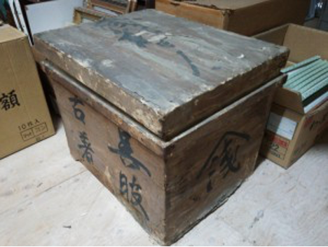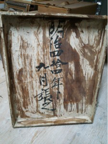この木箱はたったひとつだけ処分されずに残っていた貴重な遺産。箱の裏側を見ると明治44年、9月。103年の時を経たものでした。安城建築の礎ともなった家業の遺品かと思うと感無量です。