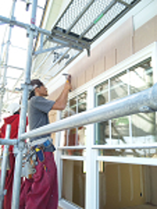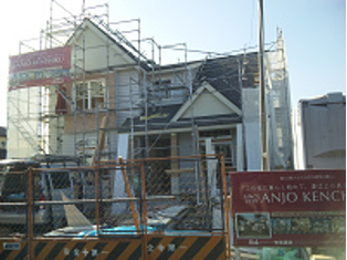 安城市内でクラフツマンスタイルの輸入住宅が間もなく完成する。ドライウォーラが室内の自分の仕事以上に外観が気になり、腕組みをしながら外装職人の仕事を見守っている。時折、足場の上の外装職人と、こうした収めにした方がもっと格好いいんじゃないか?と話している。作業をする職人たちから誇りが感じられる。