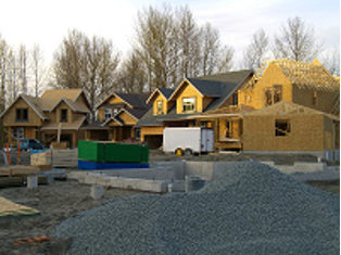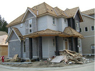 写真は、建て方中の現場であり、現場フレーミングで施工される純粋な北米式ツーバイフォー工法で建てられている。