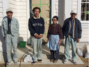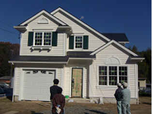 週末に足場が外れ、自分たちの造った家をお施主さんのお婆さんと共に眺める職人