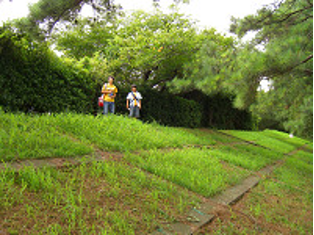 梧陵と村人たちが造った堤防を歩いていると、猛暑の中お婆さんが手鎌で草刈をしていた。
