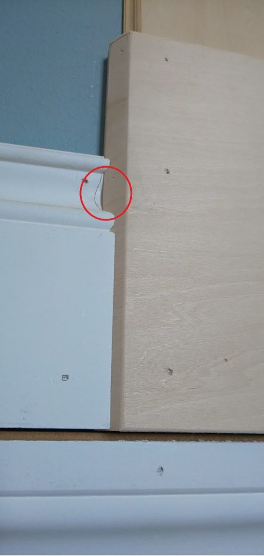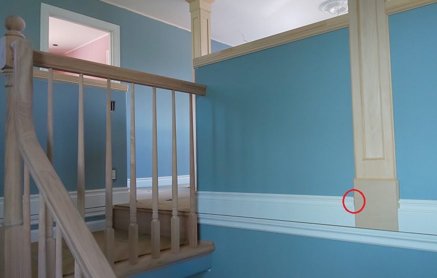 柱の根元部分の角が斜めの為、それに合わせて巾木(ベースボード)をカットするとどうしても凹みのある巾木の中央に隙間が生じてしまう。その部分に手づくりで加工した極小さな埋木を差し込んだ巧みの技である。