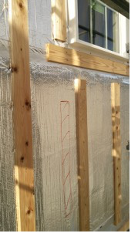 ↑外壁材下に施工されている遮熱材。この遮熱が熱を反射させる為、、断熱材の熱のこもり現象が大幅に削減されます。