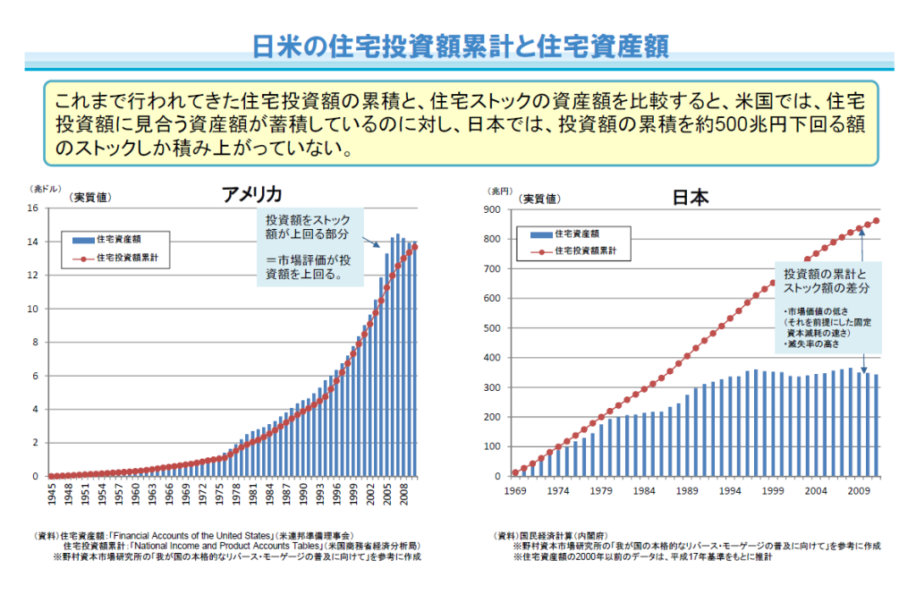 下記は日米の住宅投資額累計と住宅資産額の表です。米国では中古市場において購入金額を上回っております。逆に日本においては投資金額の半分もありません。これに対してエコノミストはその理由をメンテナンスを怠っているからだと分析していますが、現実はそうでは無く、中古市場においてユーザーがこの家なら暮らしてみたいと思う魅力的な家が無いと言うことが実態の様です。残念ながら先進国でこの様に大幅に資産価値が下落するのは日本だけの様です。