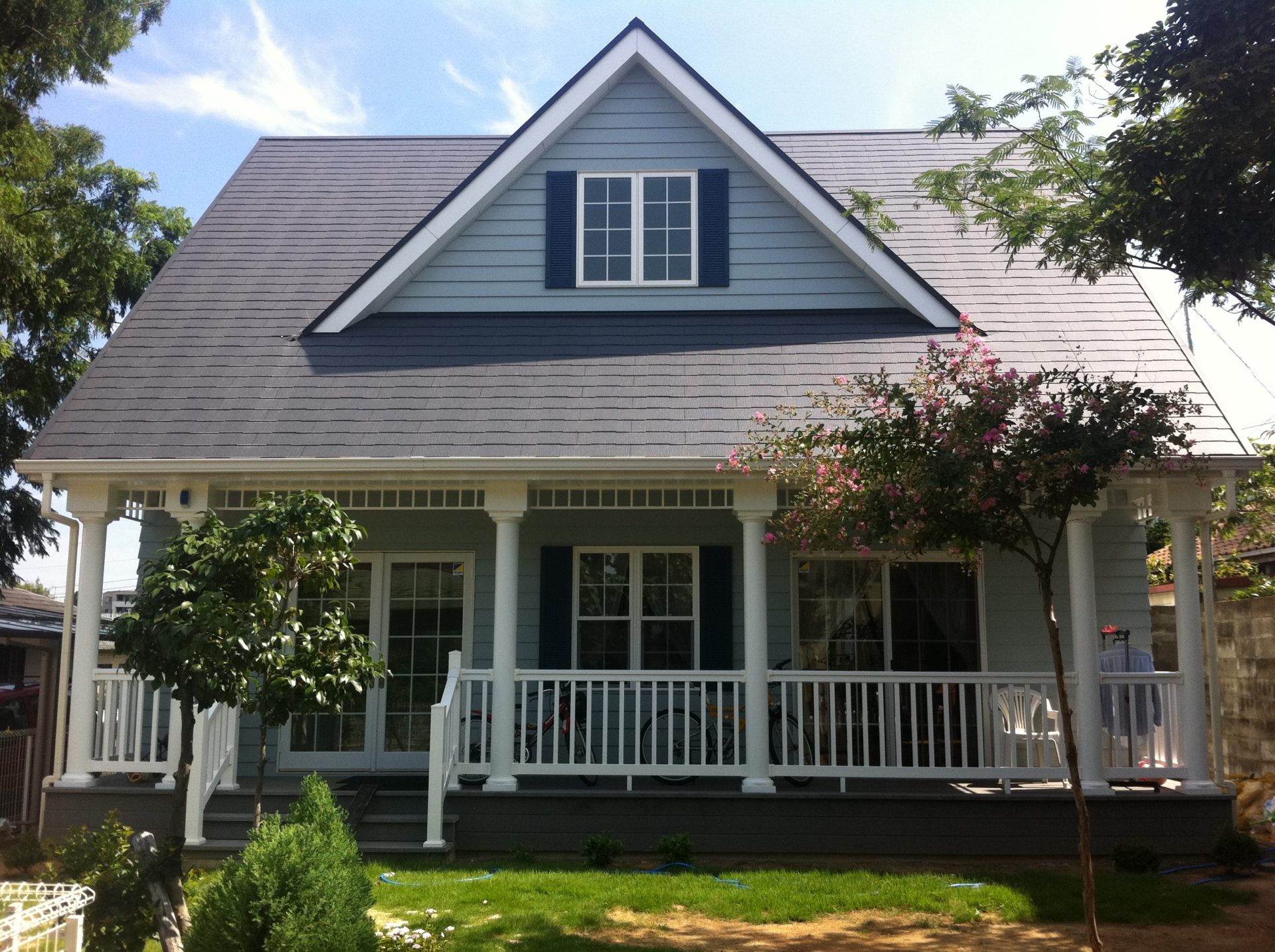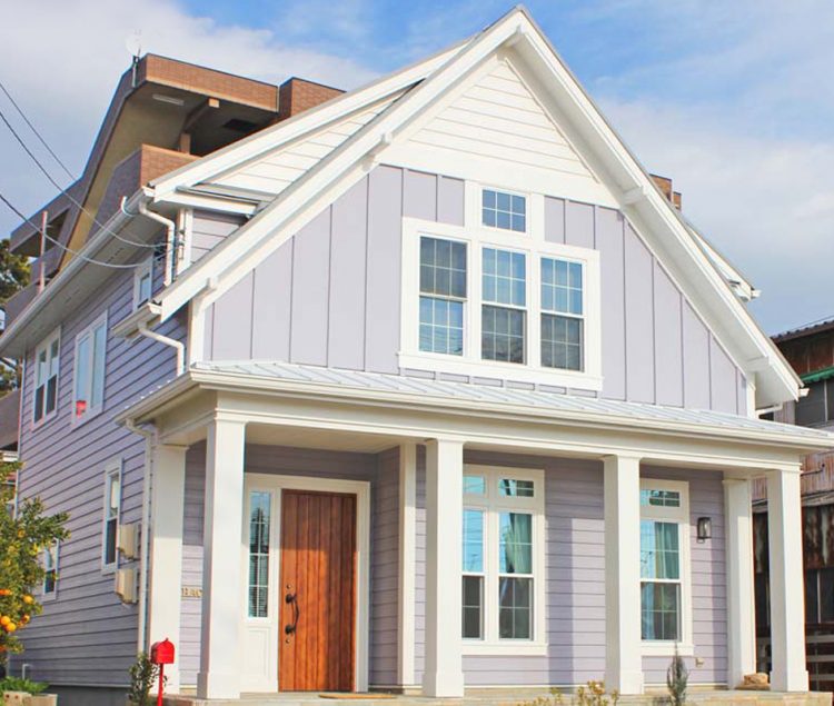 屋根は大きく、海が眺められるようなカバードポーチのあるデザインが特徴です。