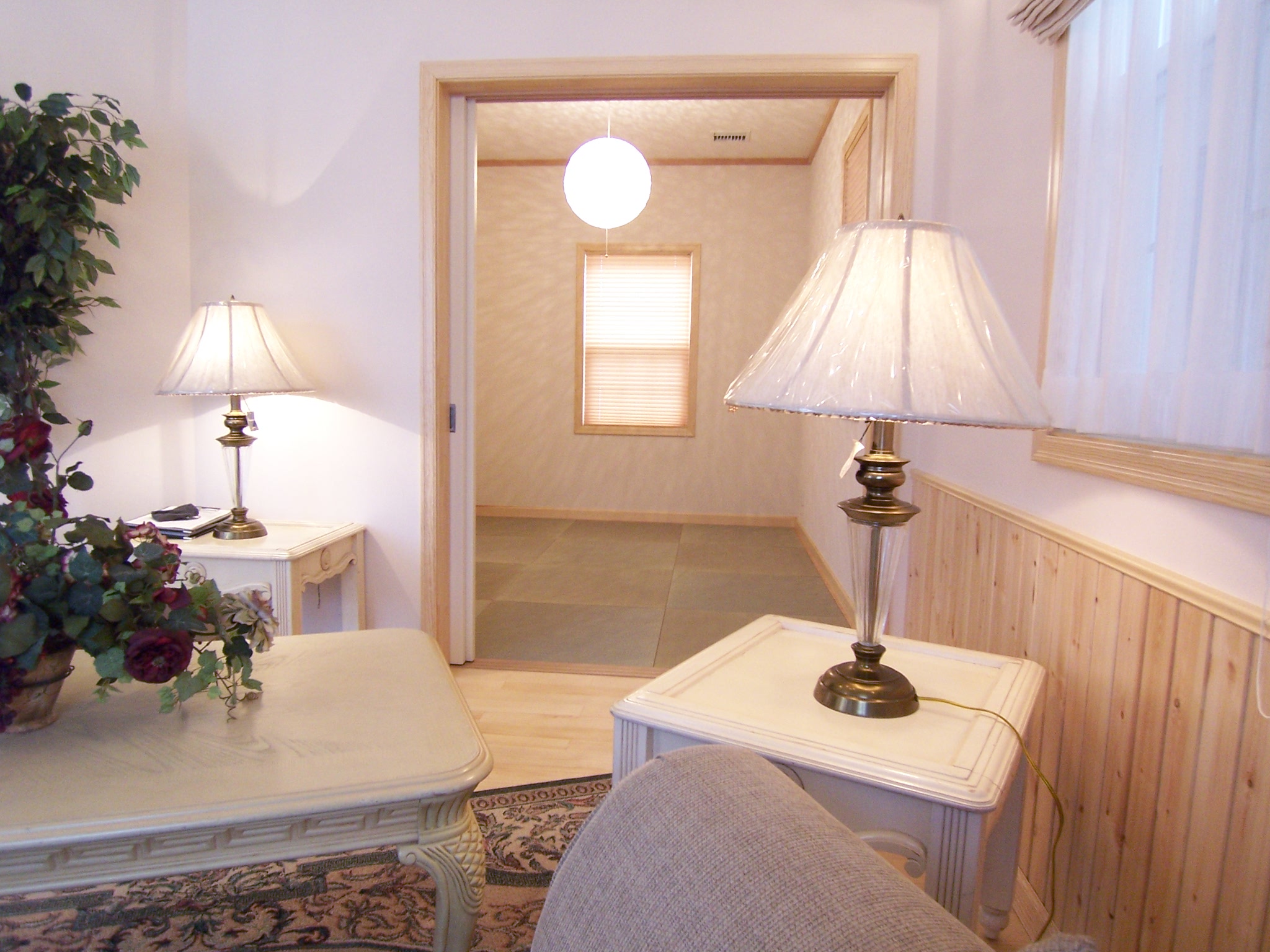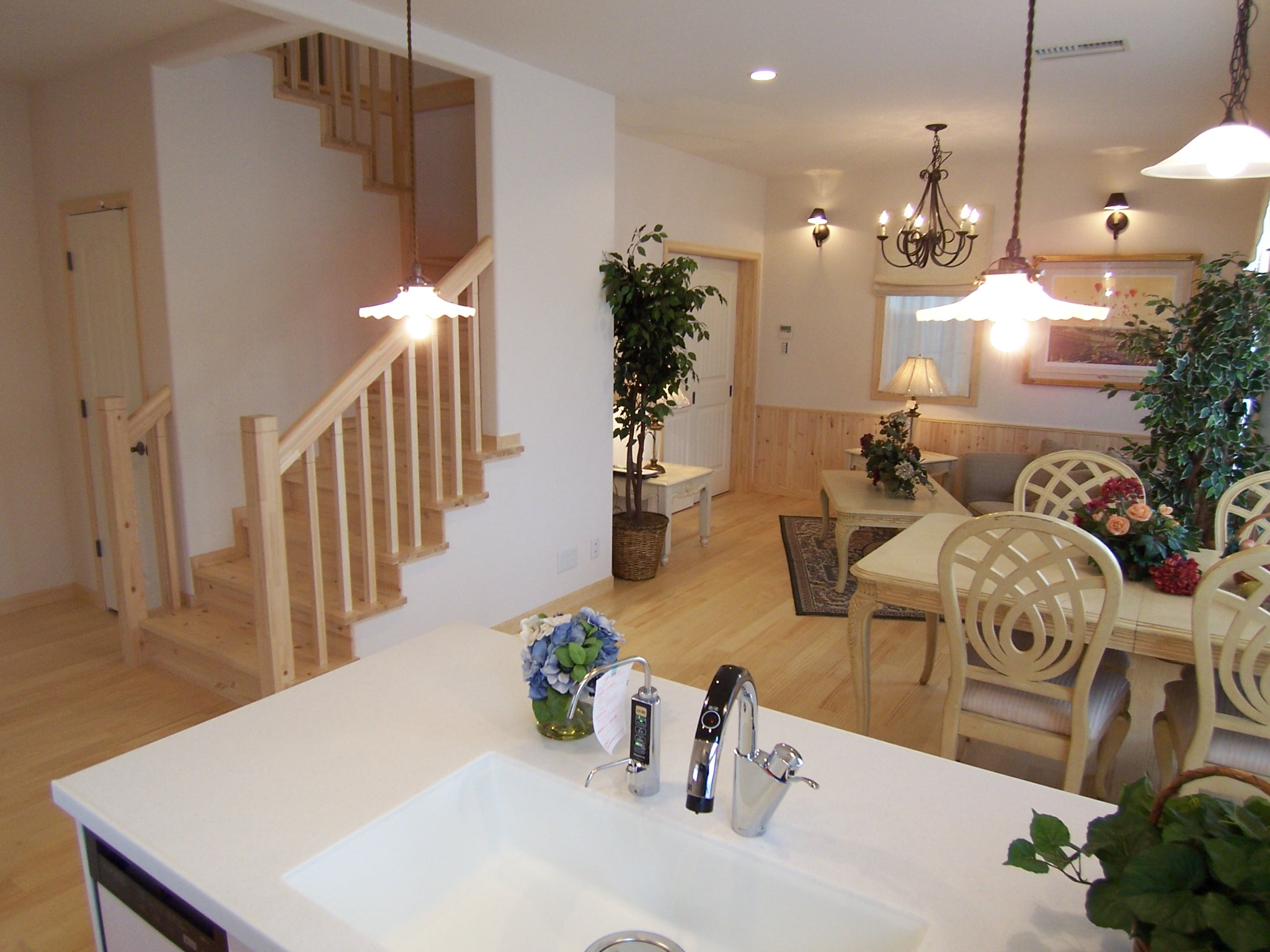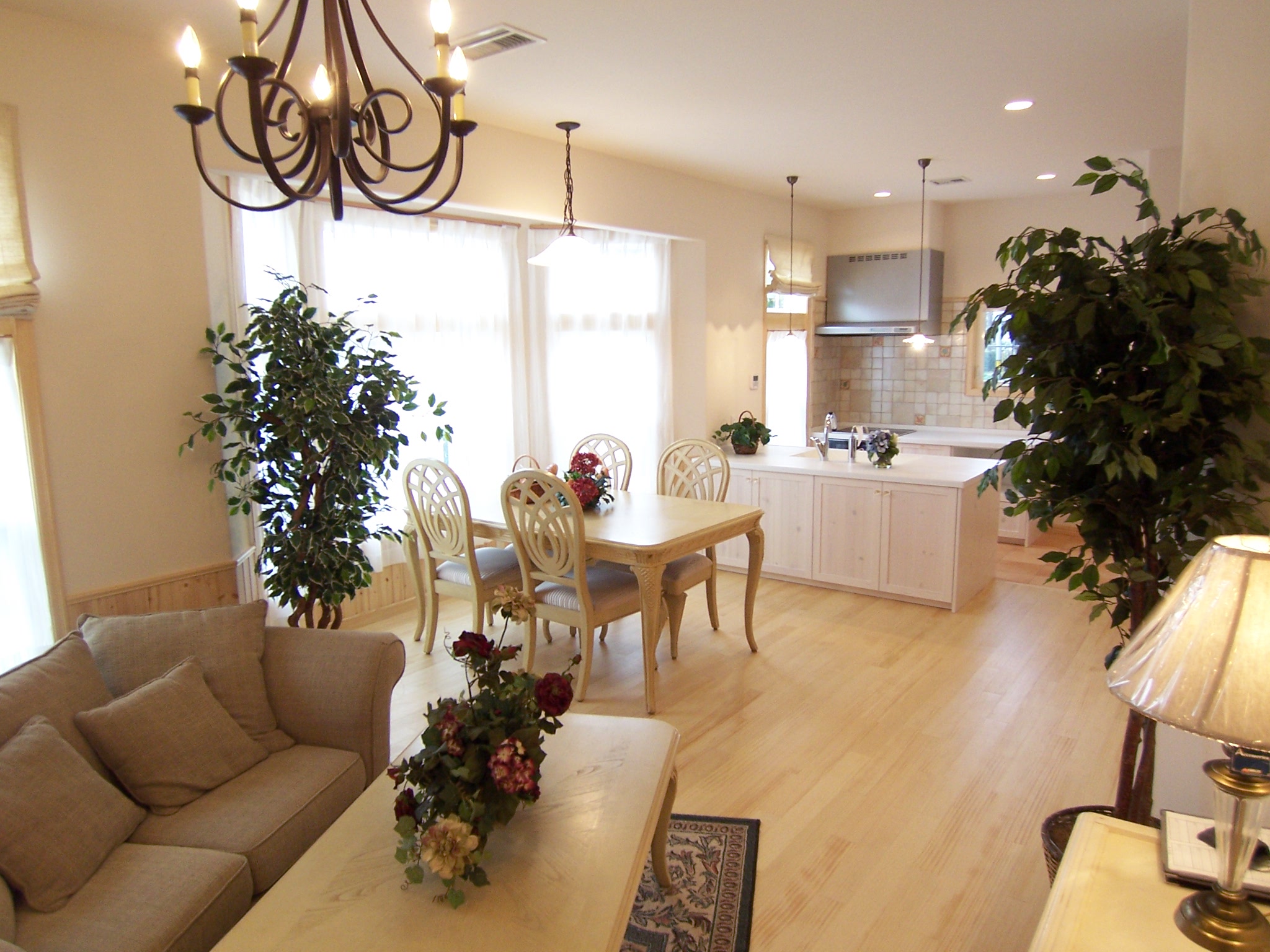 北欧の人々が観ても本物だと感じてもらえるように、破風や窓回りベランダの手すりに至るまで、造りこんだ北欧住宅。アイアンの照明がしっくりとなじむリビングは北欧らしいあたたかみがあります。パイン材の床は裸足で歩いても違和感のない素朴な優しさが感じられます。